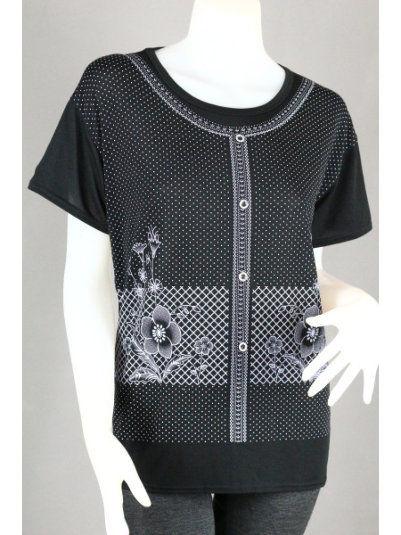 เสื้อสีดำ ผ้าพิมพ์ลายดอกไม้ รอบอก 39 นิ้ว ความยาว 25 นิ้ว